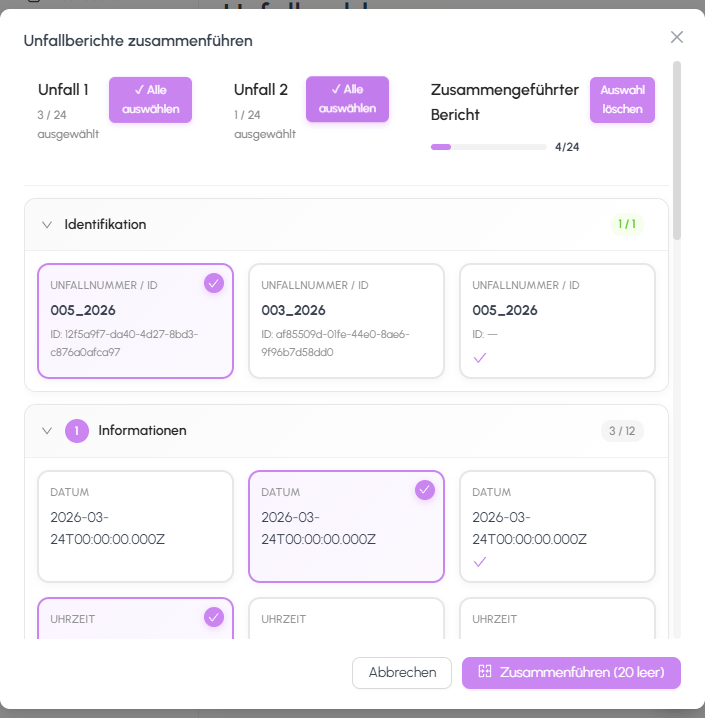 - Prüfen Sie alle Abschnitte (Stammdaten, Unfallgegner, Zeugen, Verletzte, Fotos und Skizzen), damit die zusammengeführte Meldung vollständig ist.