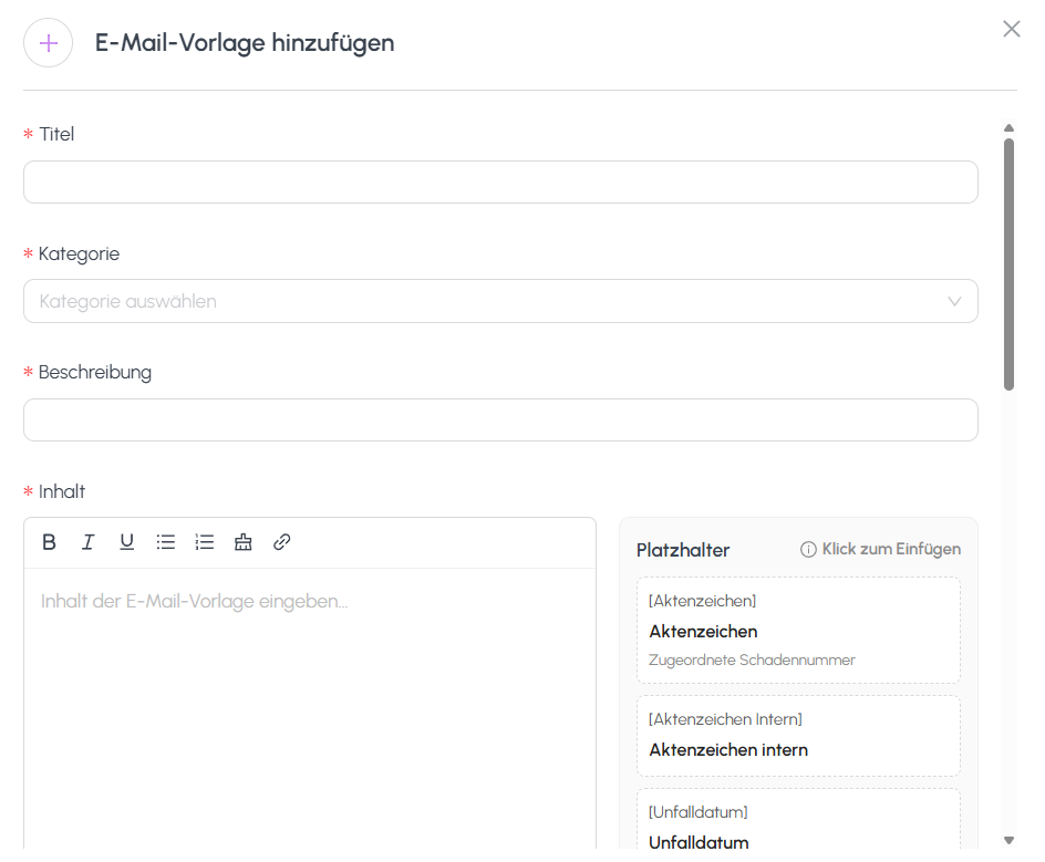 This guide explains how to create and maintain email templates used for outgoing correspondence, and how placeholders are automatically replaced with claim data.