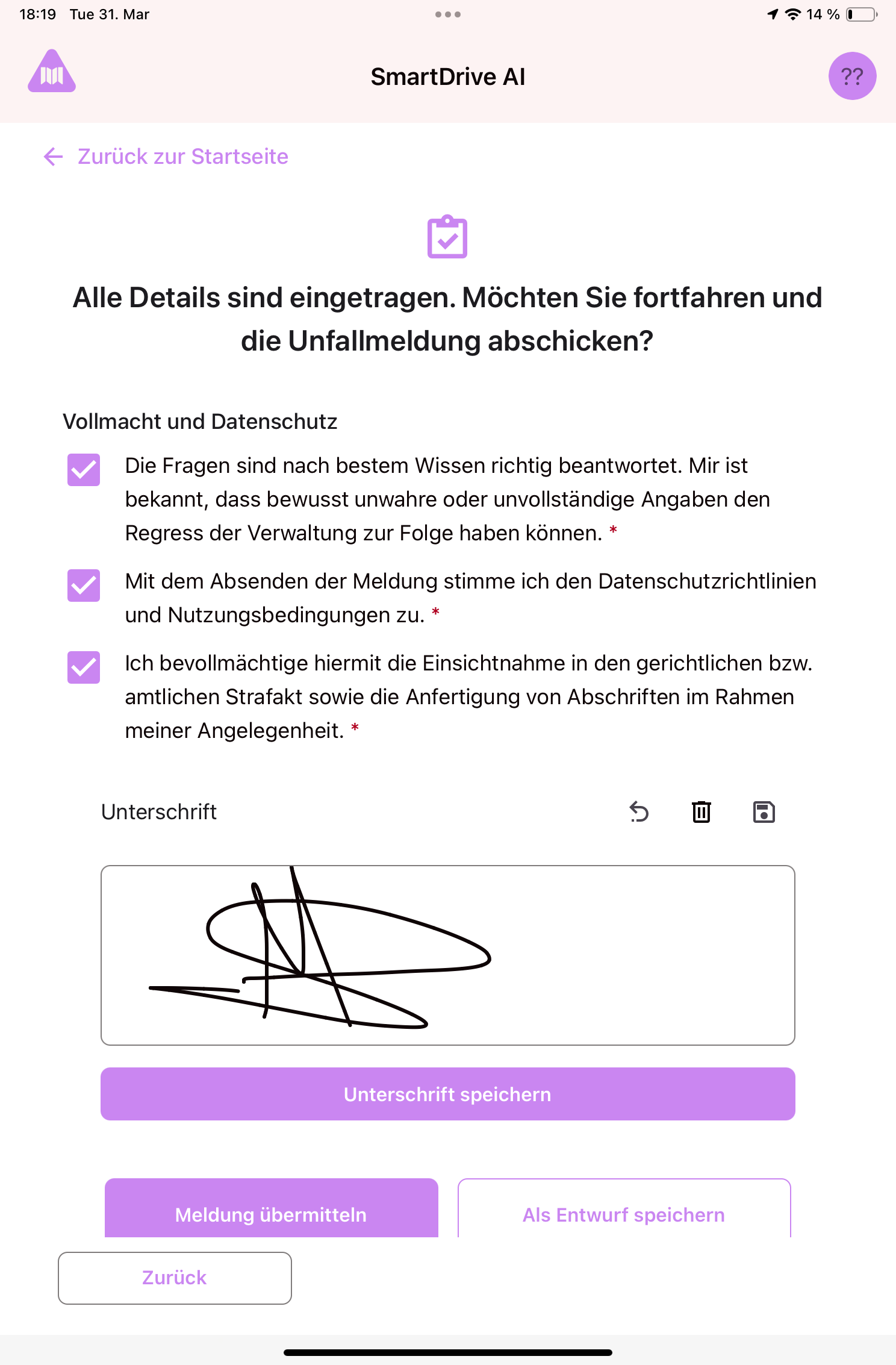 If you're not ready to submit yet, tap "Save" instead. This saves the report as a draft. You can return to it later from the home screen by tapping "Create Accident Report". Your draft will be loaded automatically.