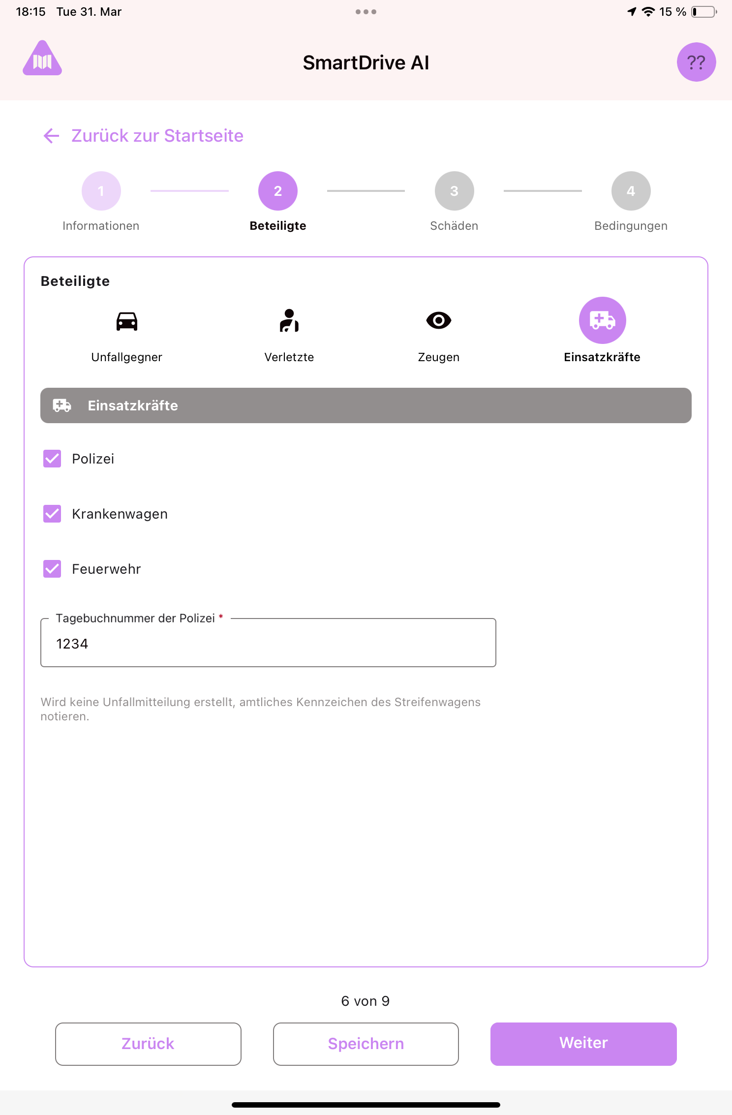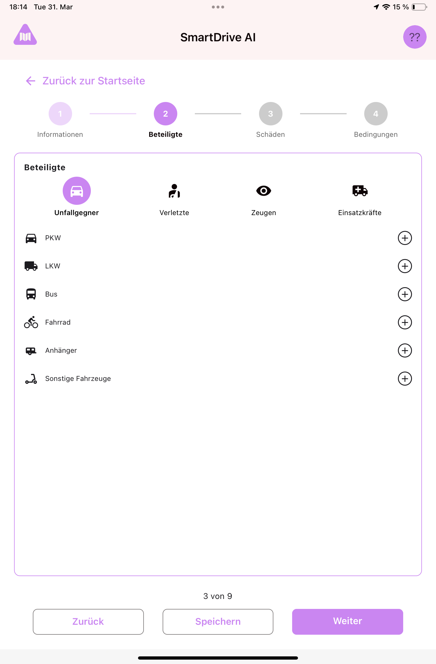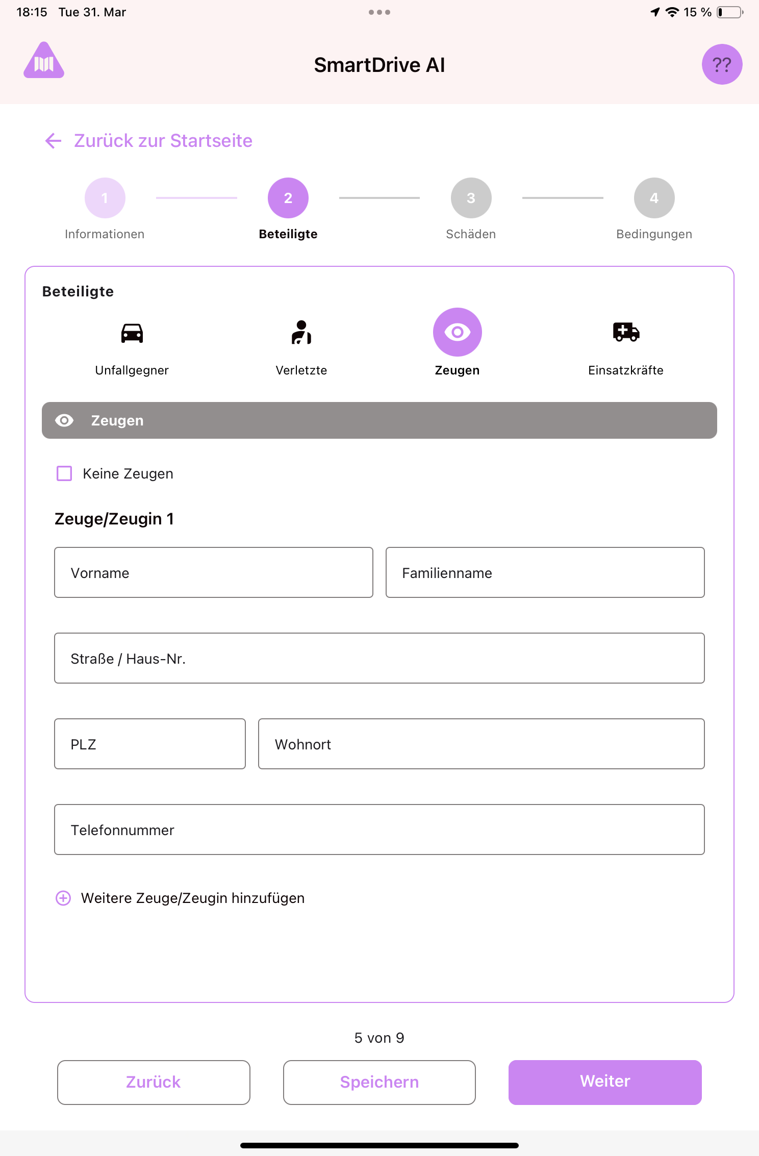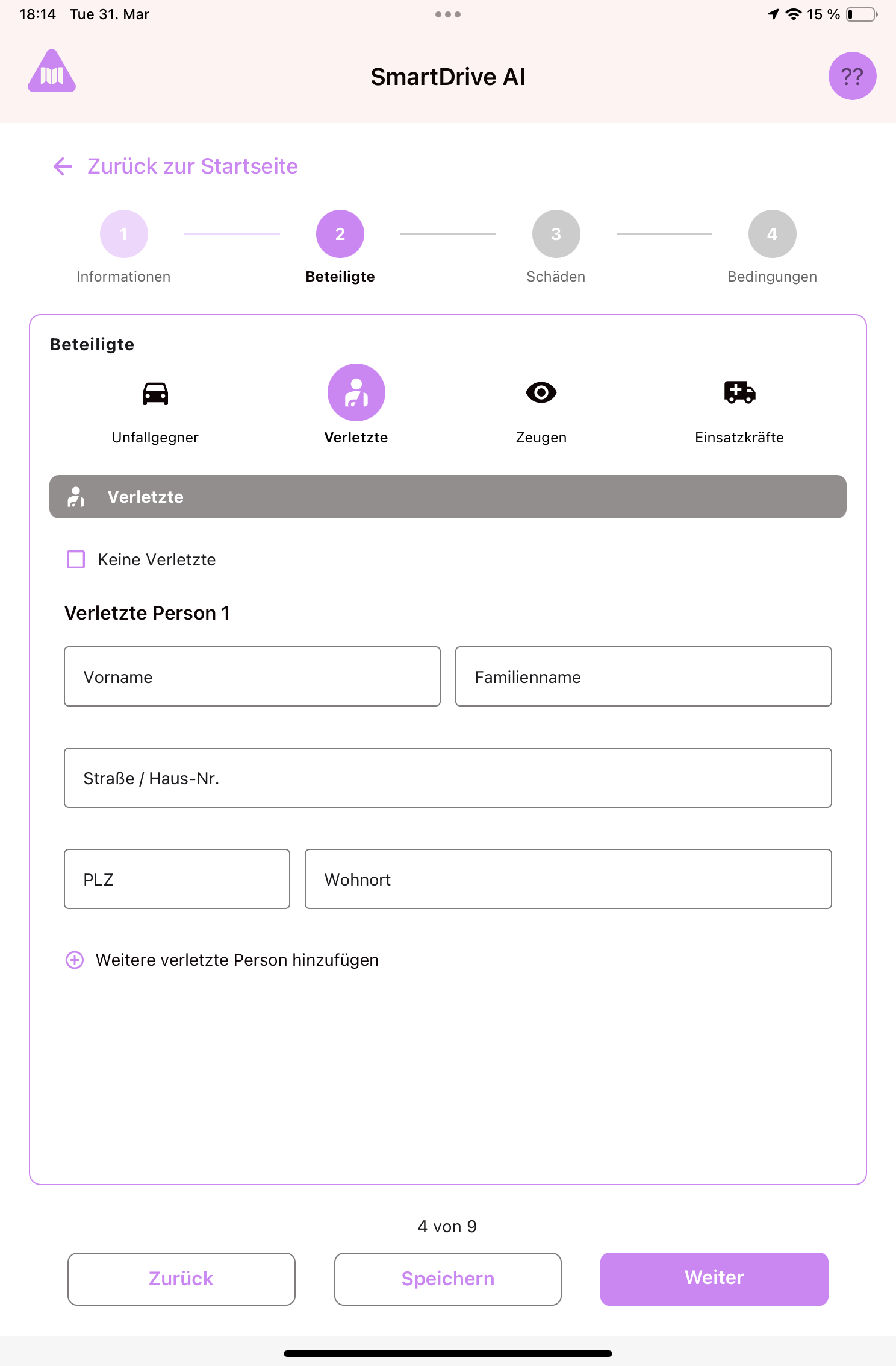 At the top of Step 2 you'll see four tabs: Opponents (Other vehicles), Injured, Witnesses, Emergency Forces. Tap any tab to switch between them.