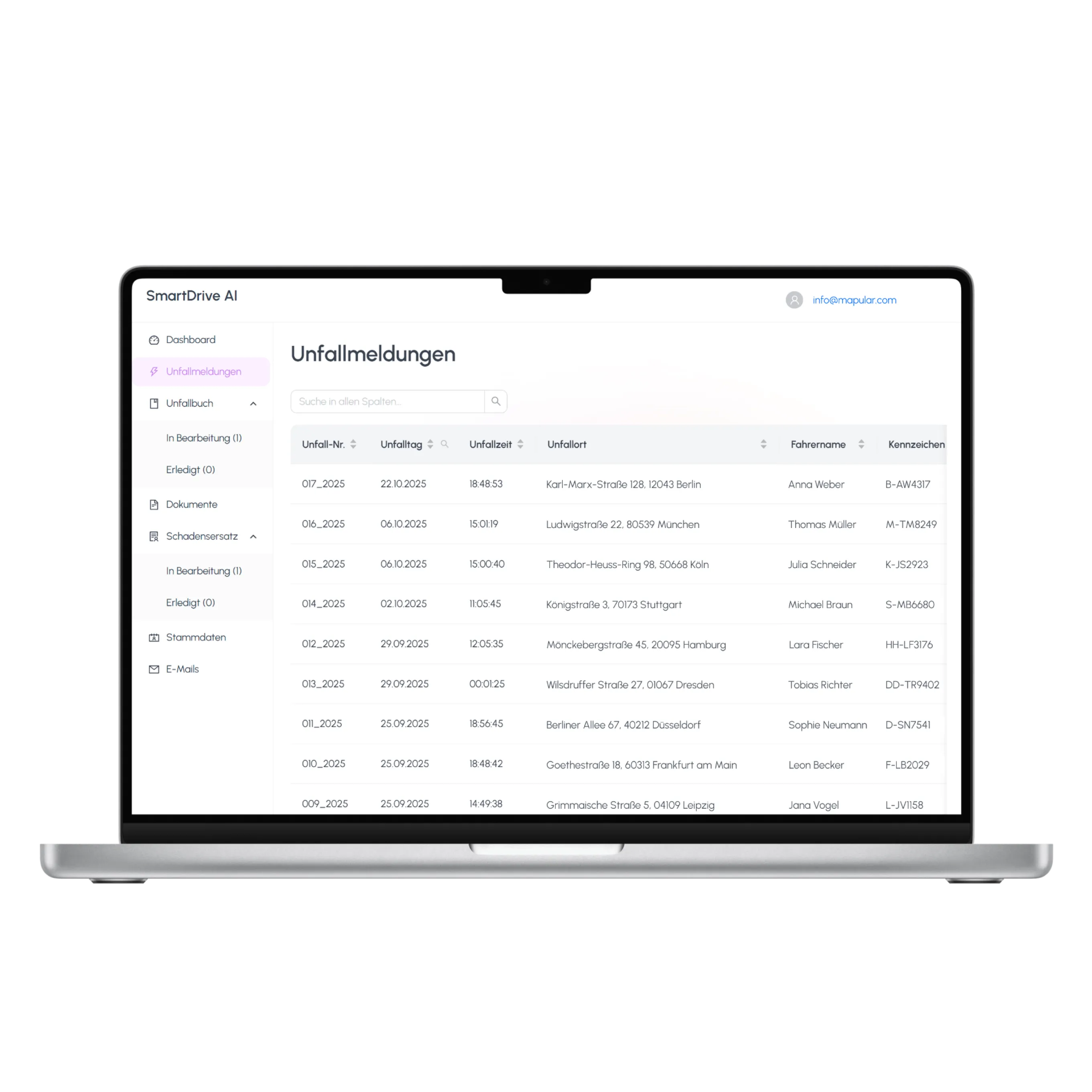 SmartDrive AI is a mobile app that lets you record accidents digitally, including photos, sketches, and all relevant details, and send the report directly to your accident management team.